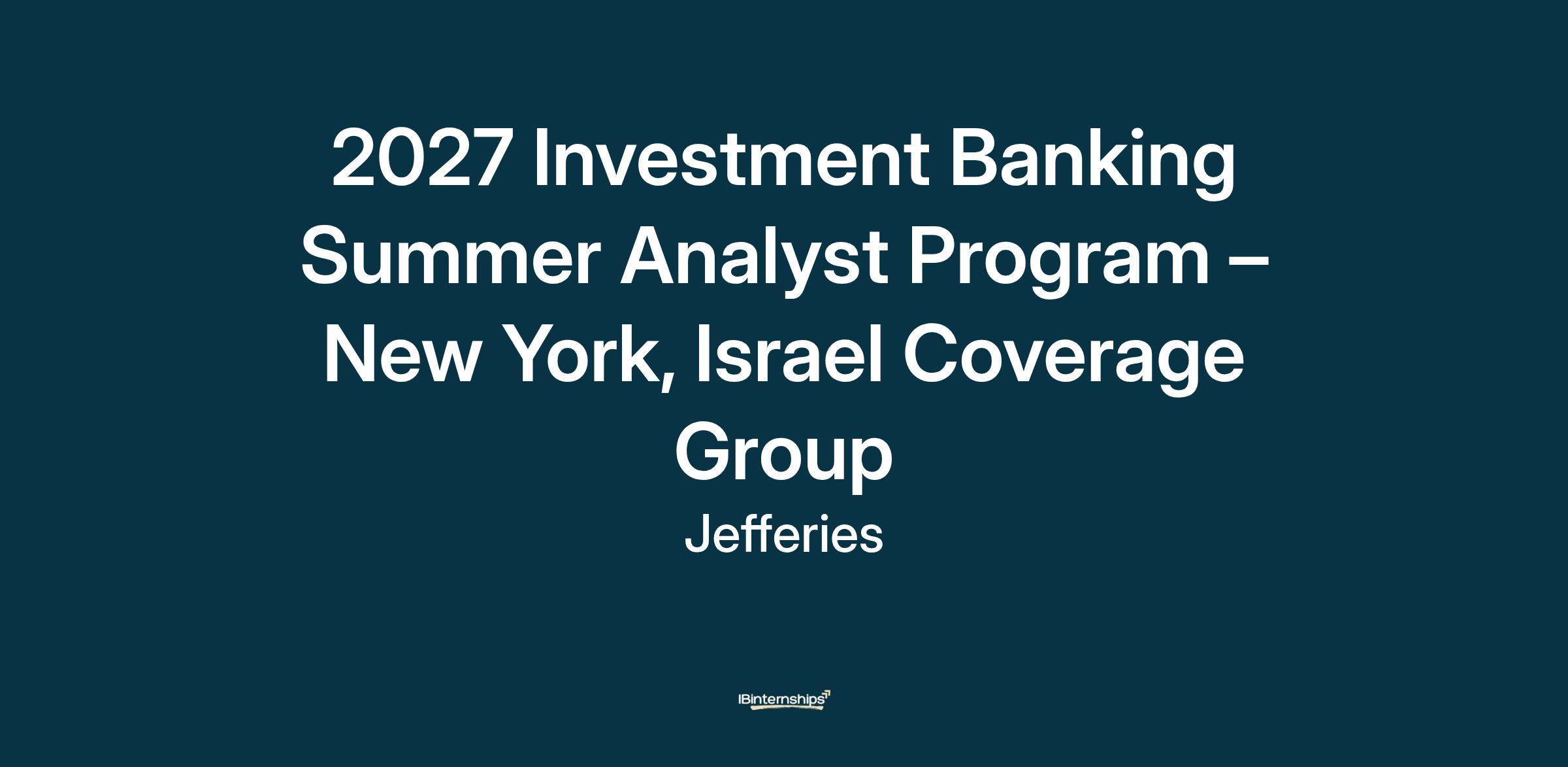 Position: Jefferies dedicated Israel team is actively looking for a summer intern for our New York office to help support all aspects of our Israeli Investment Banking effort. The opportunity in Israeli related banking is growing rapidly. The companies emerging out of Israel are larger and more mature than ever before and the cross-border opportunity with these companies continues to grow. The candidate will be working directly with both senior and junior bankers across the firm globally.