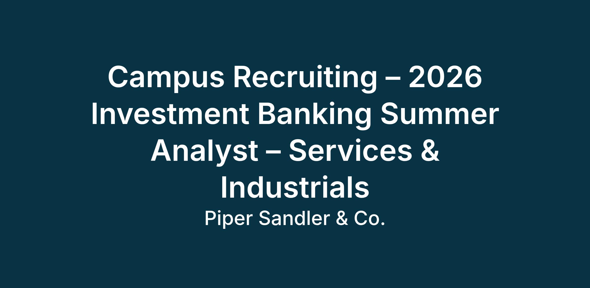 Piper Sandler is currently seeking undergraduate students for our 2026 Investment Banking Summer Analyst Internship Program with our Services & Industrials team. Summer Analysts generally work 10 weeks within an industry or product group in Investment Banking and have the opportunity to learn financial modeling and basic analysis of companies and industries, as well as gain an understanding of the dynamics of the capital markets.