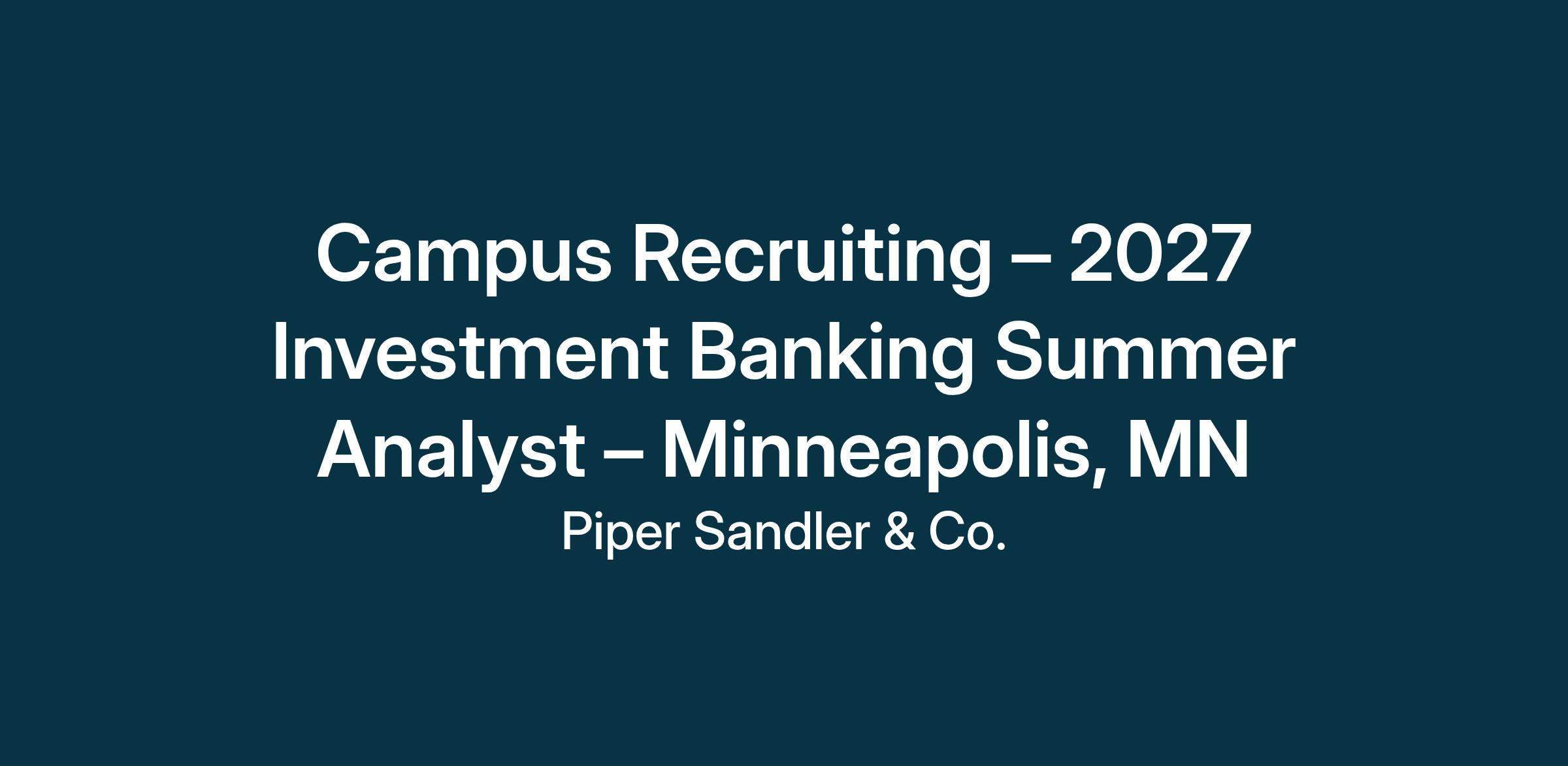 Piper Sandler is currently seeking undergraduate students for our 2027 Investment Banking Summer Analyst Internship Program. Summer Analysts generally work 10 weeks within an industry or product group in Investment Banking and have the opportunity to learn financial modeling and basic analysis of companies and industries, as well as gain an understanding of the dynamics of the capital markets.